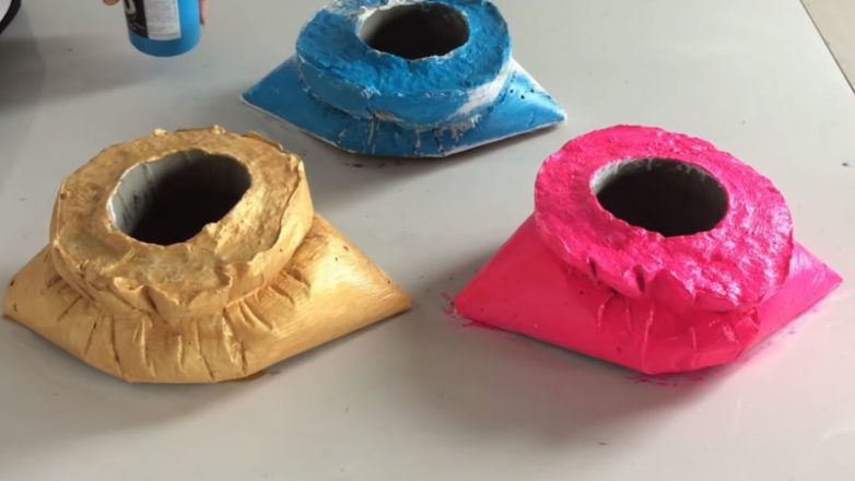 Завязываем пакет сверху и перетягиваем верёвкой вокруг. Оставляем в таком виде до полного высыхания. Всего сделаем три аналогичных поделки.