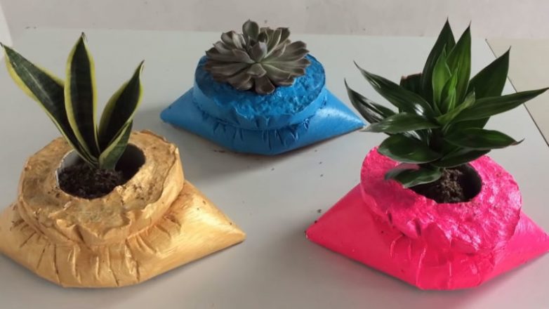 Подробнее о том, как сделать необычный цветочный горшок из цемента и пластикового пакета, смотрите в видео ниже: