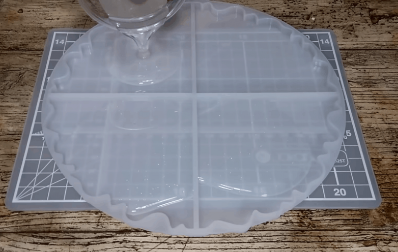 Заполняем каждый из отсеков молда смолой наполовину, разравниваем ее по поверхности и даем застыть. Чтобы смола быстрее застыла, по желанию используем зажигалку.