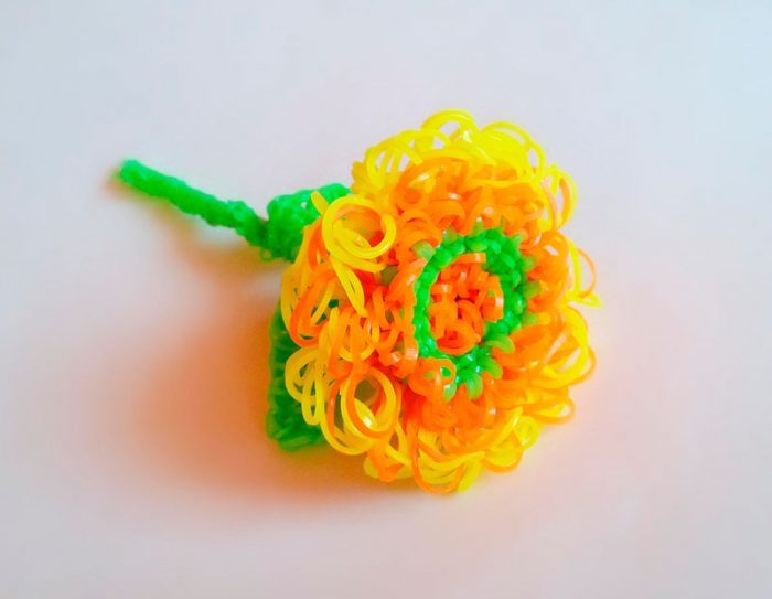 Проведите крючок в петельку, намотайте 2 оранжевых резинки на крючок 2 раза, прицепите зелёную резинку, протяните её через оранжевые резинки и через петли на цветочке, затем завяжите узелок. Так проплетите до конца этого ряда. Сплетите 3 таких ряда.