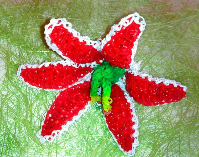 Проплетите красными резинками по одной через петлю, через любые 6 петель чашелистика. Разверните и проплетите по красным петлям ещё 5 резиночек.