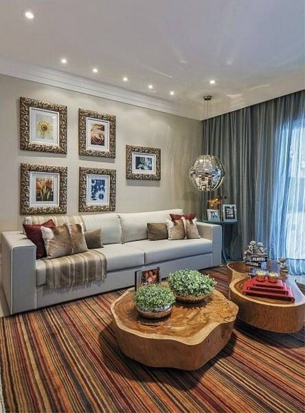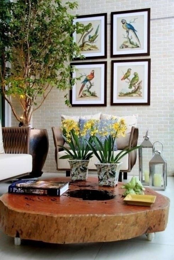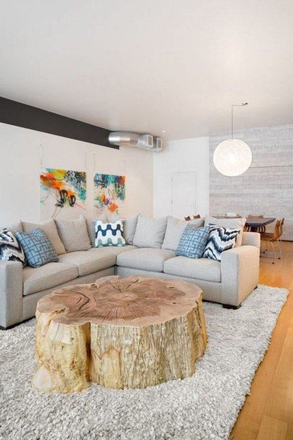 Выбирайте тумбы из пней для оформления гостиной. Здесь их можно использовать, например, в качестве небольшого столика у дивана, на котором удобно разместить чашку кофе и книгу во время отдыха или для установки лампы и декоративных элементов.
