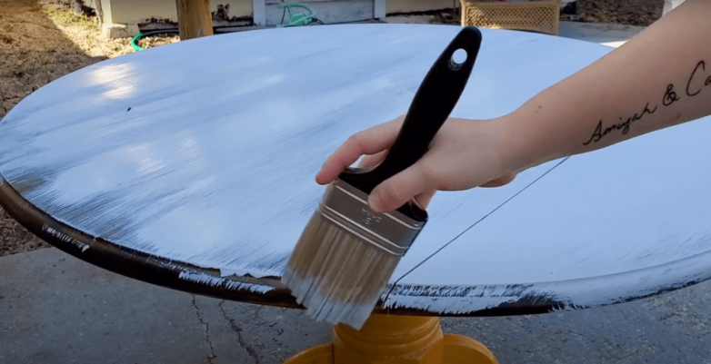 Если покрытие покажется вам слишком темным или светлым уже после высыхания, ничего страшного. Просто добавьте штрихов необходимого цвета. Например, в нашем случае, чтобы стол гармонировал со стульями, пришлось уже в финале добавить ему светлых штрихов.
