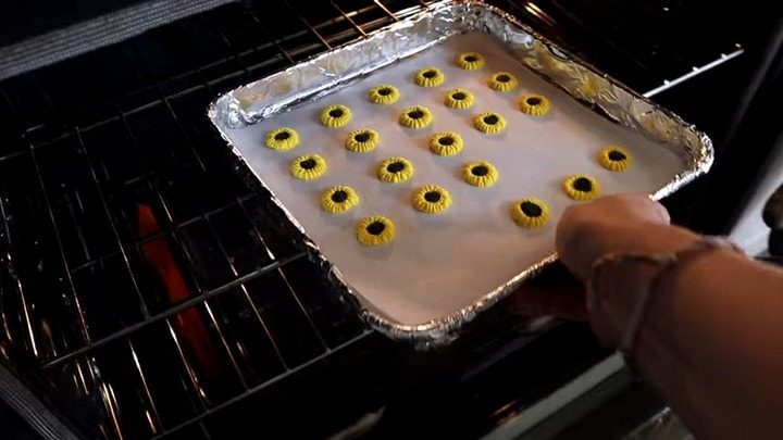 После того, как вы слепили задуманное количество подсолнухов, выложите их на застеленный бумагой противень. Прогрейте духовку до температуры, указанной на этикетке полимерной глины. Обычно она составляет 110-130 градусов, в зависимости от марки. Поставьте противень в духовку на 15-20 минут. После этого вытащите и дайте цветам полностью остыть.