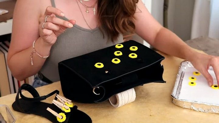 Наклеивая подсолнухи на босоножки, прижмите их на некоторое время прищепками — так они «сядут» надёжнее.