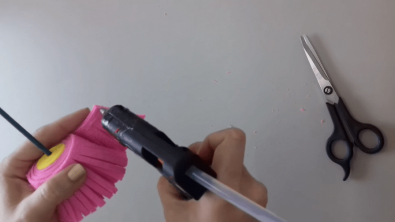 Плотно накручиваем фоамиран, образующий лепестки, дополнительно фиксируя его при помощи клея.