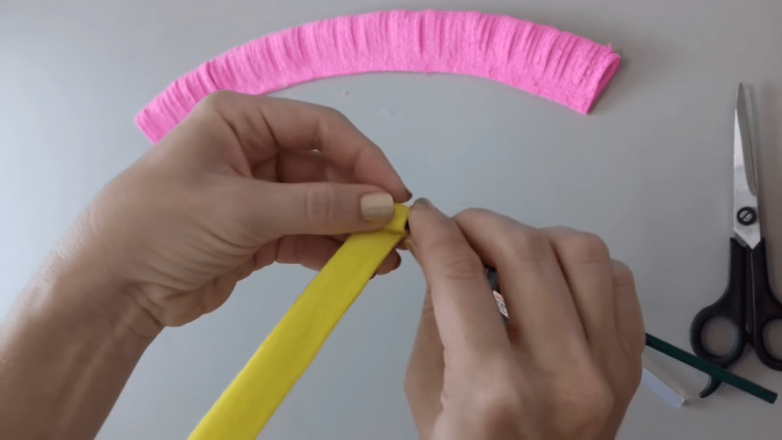 Еще одна полоса, но уже желтая, понадобится для формирования серединки. Ее ориентировочная длина будет составлять 20 см, а ширина 3 см. Ее также сгибаем вдоль и проклеиваем. Из длинной шпажки делаем заготовку под стебель, просто окрашивая ее в нужный цвет.