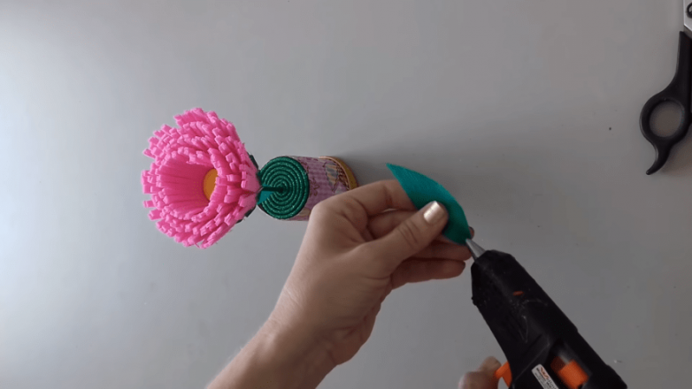 Дополняем герберу листьями из гофрированной бумаги, а затем расправляем сам цветок. Сделать это можно при помощи тепловой обработки. Достаточно будет немного подуть на цветок горячим феном или подержать его над пламенем, а затем, не дожидаясь остывания, расправить и слегка распушить.