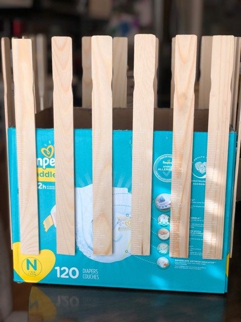 На картонную коробку приклейте деревянные или картонные заготовки по всему периметру.