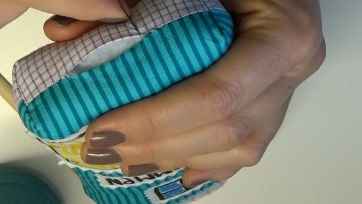 Выверните изделие и набейте домик синтепоном, холлофайбером или пенополистеролом (шариками пенопласта). Зашейте отверстие.