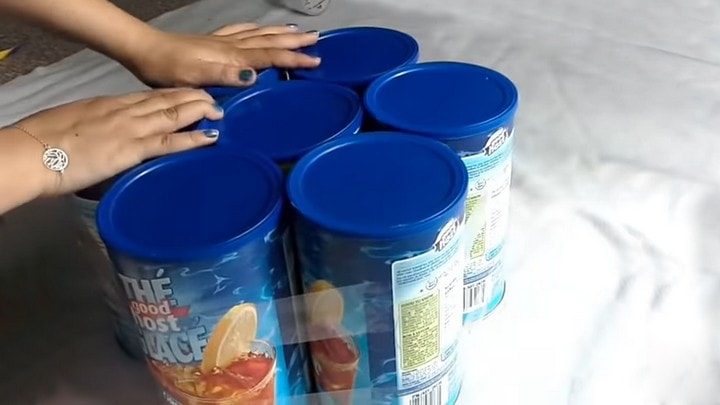 Для основы вам понадобятся любые высокие жестяные банки, например из-под гранулированного чая или чипсов. Составьте их вместе и смотайте скотчем.