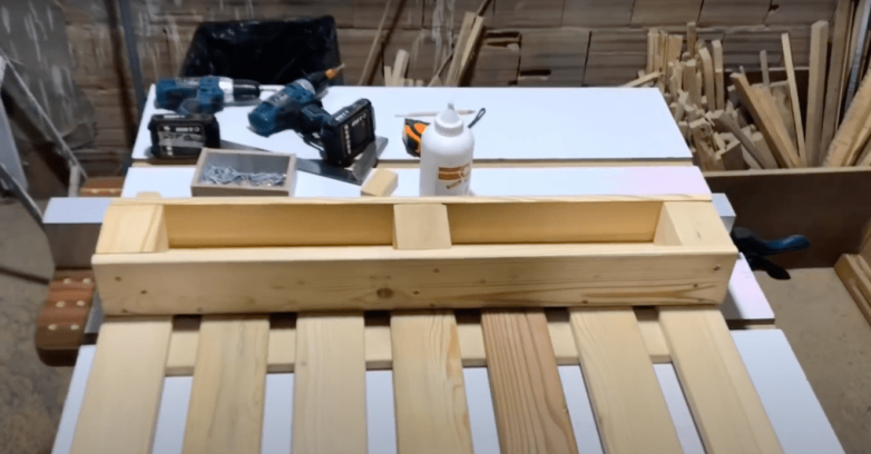 Из оставшихся от паллеты досок и брусков собираем простую полочку с двумя отделениями: 3 стенки и 3 перегородки. Прикручиваем полочку к корпусу будущей вешалки по своему усмотрению.