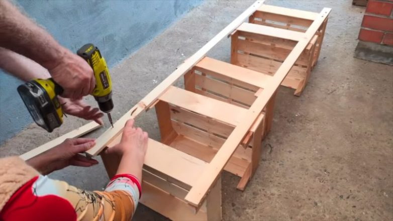 Положите ящики в ряд и прикрутите две планки с одной стороны с учетом ножек. Затем переверните и прикрутите шурупами ещё две планки.