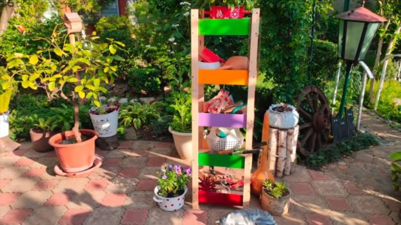 Впечатляющая, устойчивая и стильная полка-стеллаж готова. Она подойдет не только для улицы и дачи — в разных вариациях её можно использовать и внутри дома!