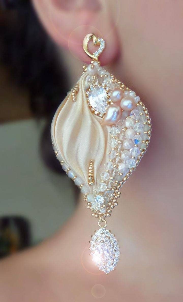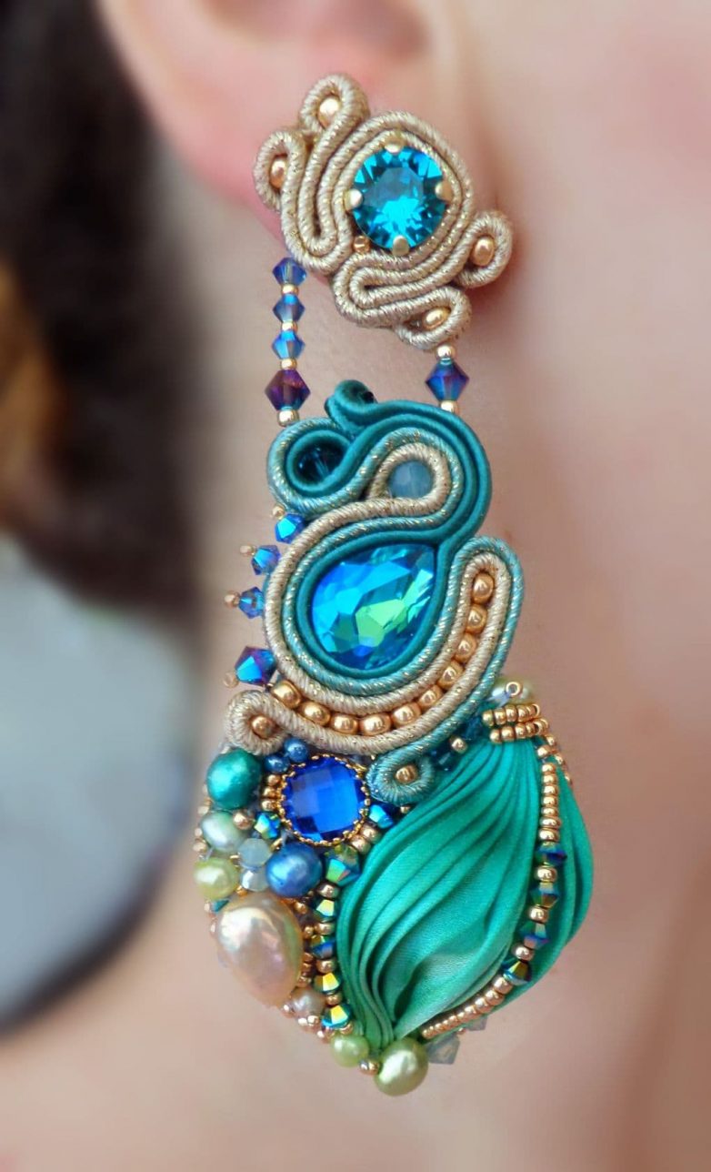 В этих серьгах сформированная из ленты капля повторяет форму рассыпанных по поверхности кабошонов, все вместе образует целостную картину.