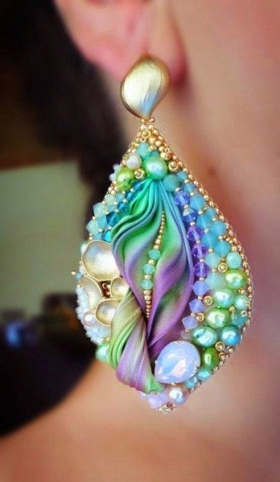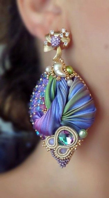 Любительницы эксклюзивных украшений по достоинству оценят серьги, сделанные с использованием ленты шибори. Дошедшая до нас из глубины веков техника окрашивания шелковой ткани позволяет получить уникальный рисунок с плавными переходами цветов.