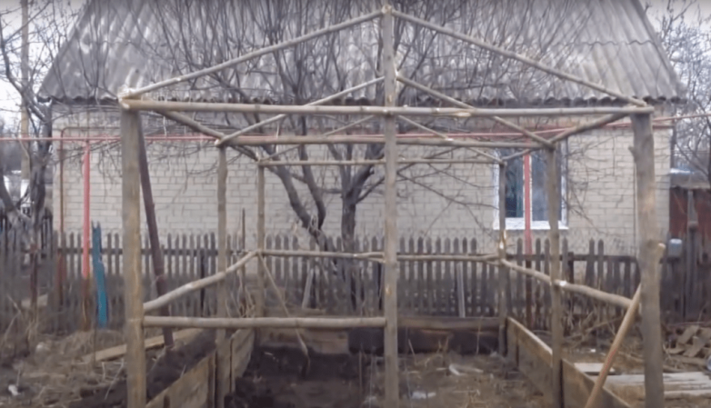 Для начала для теплицы нужно собрать каркас. В нашем случае для него был использован самый бюджетный материал — нарезанные толстые ветки и стволы. Высота каркаса в центре — 3 м, по стенкам — 2.5 м, итоговый размер теплицы — 4 м на 6 м.