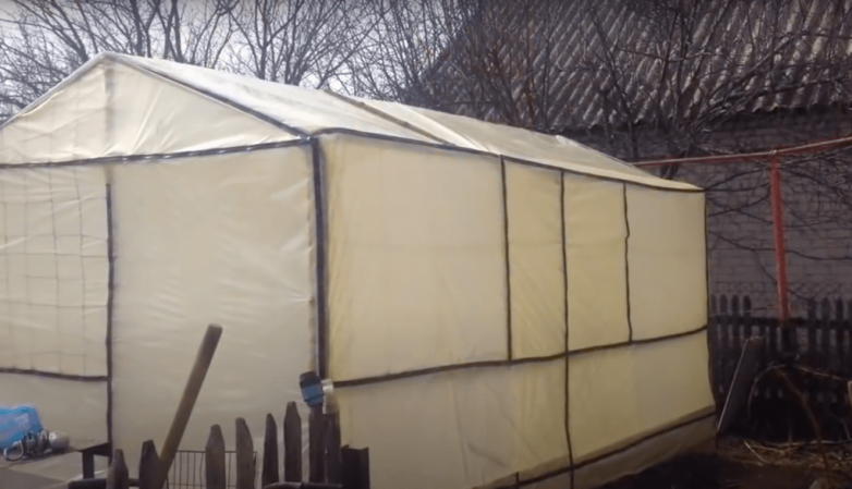 Когда каркас готов, его нужно перекрыть и здесь 2 варианта. Для перекрытия можно использовать парниковую пленку, закрыв ею каркас по всему периметру.