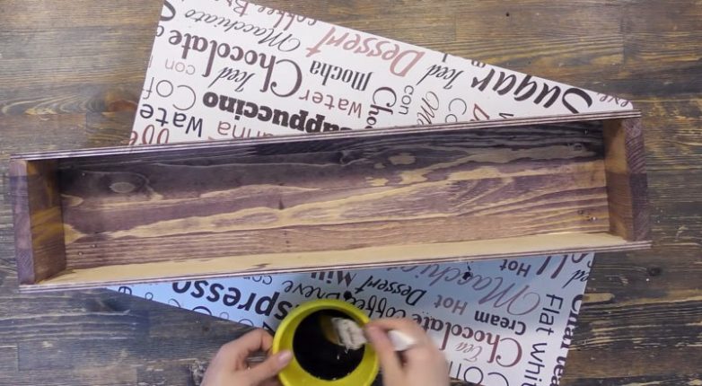 Покройте ящик одним слоем морилки, а после его высыхания нанесите еще слой.