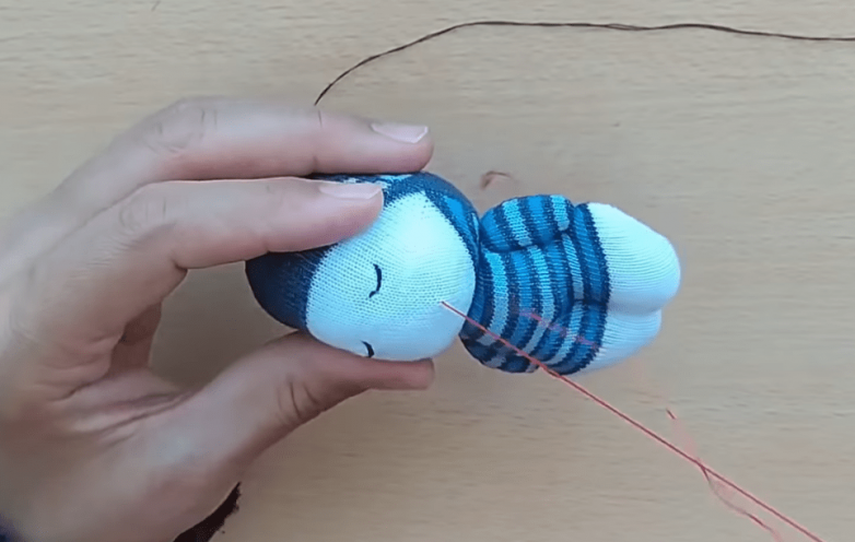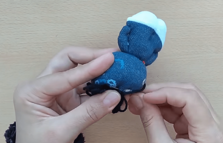 Не обрывая нить пропускаем ее внутри носка и выводим сбоку, чуть выше окончания ножек. Прокладываем насквозь шов так, чтобы в результате сформировалась ручка. То же повторяем с другой стороны. А затем перехватываем куском нити носок поперек немного выше верхней части рук и затягиваем, чтобы обозначить шею.