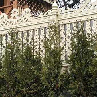 Ажурные деревянные заборы для дачи защищают от животных, но не препятствуют общению с соседями.