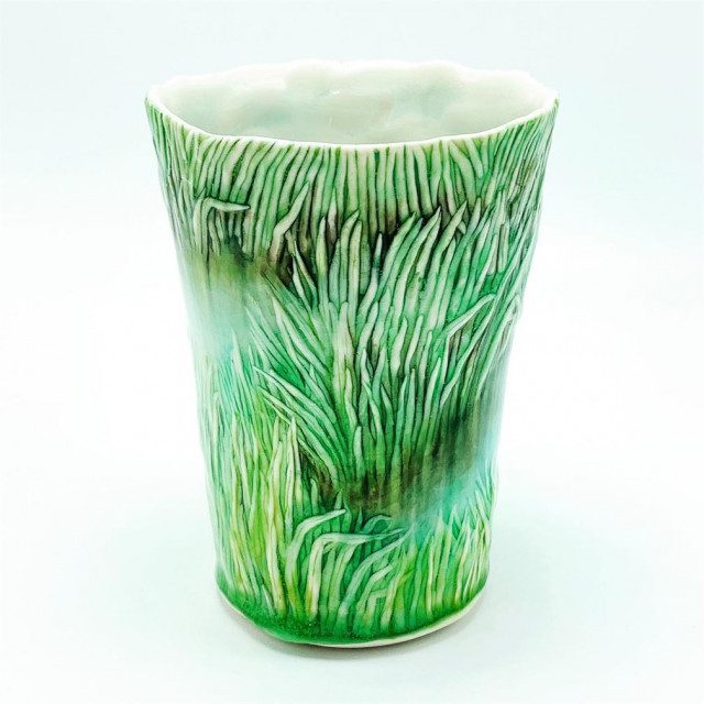 Аккуратно наслаивая травинку на травинку, камыши, сосны и цветущую вишню, она создаёт кружки, чашки, миски и другую посуду, которая превращается в настоящие произведения искусства.