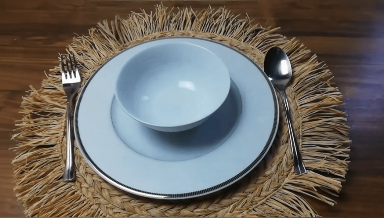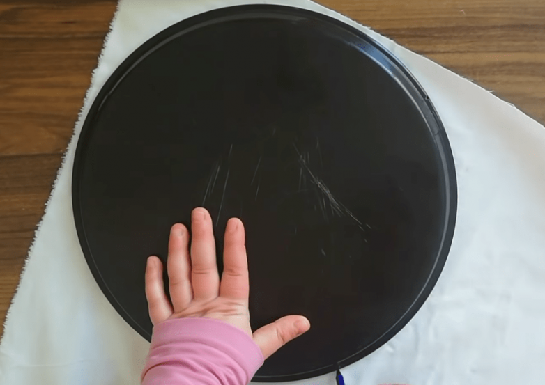 Забегая немного вперед, откроем тайну: конечной целью является создание дизайнерского коврика для сервировки. Основой для него станет подкладка из грубой льняной ткани или мешковины. Чтобы не просчитаться с размером, используем вместо лекала обычный поднос для посуды. Задав нужную форму, вырезаем заготовку, при необходимости обрабатываем край.