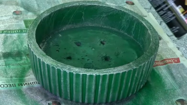 По истечении указанного времени выньте ведро — цемент уже принял нужную форму, хотя и не до конца высох. С помощью инструмента сделайте отверстия. Оставьте ещё на сутки.