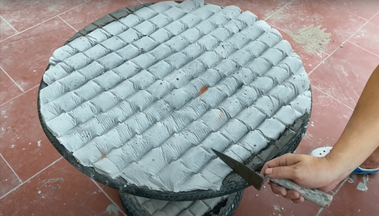 Соединяем готовые части стола между собой, например, склеивая их при помощи цементного раствора. Если где-то недостает части рельефного рисунка, например, на краях, формируем его также при помощи цемента.