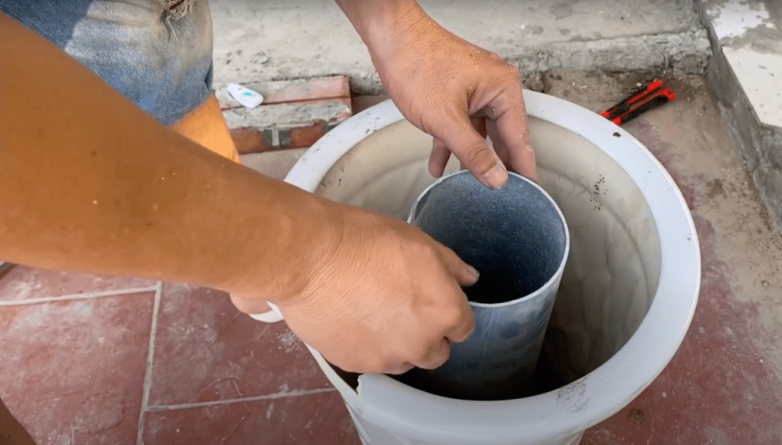 Теперь переходим к самой ножке стола. В нашем случае ее роль выполняет поломанный пластиковый цветочный горшок достаточной высоты. Чтобы ножка, а вместе с ней и стол, были устойчивыми внутрь горшка устанавливаем кусок пластиковой трубы.