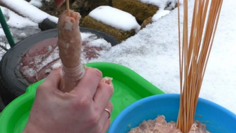 Внутрь добавьте фарш. Рядом поставьте стакан дном вверх. На стакан наденьте бутылку с фаршем, вставьте шпажку в горлышко и медленно проталкивайте бутылку вниз — таким образом, фарш выдавливается из горлышка и нанизывается на шпажку.