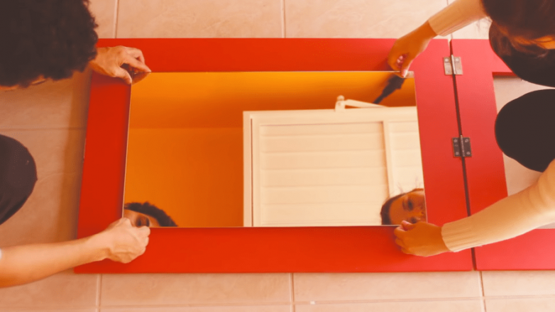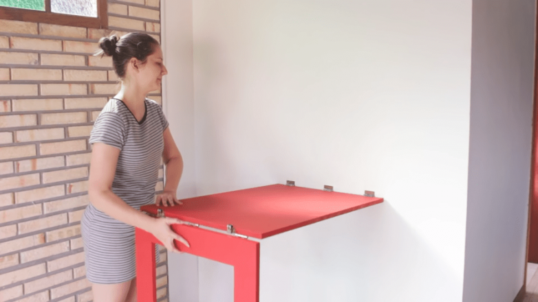 Если вы из-за недостатка свободного места всегда считали обеденный стол роскошью, то эта идея также может оказаться кстати. Все, что понадобится для ее реализации — 2 листа ДВП, рояльные петли, крепеж и подходящее по размеру зеркало.