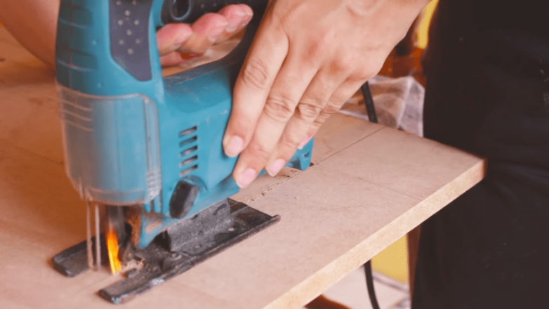 Теперь середину нужно просто вырезать. Обработанный лист одновременно будет выполнять функцию откидной ножки и рамки для зеркала.