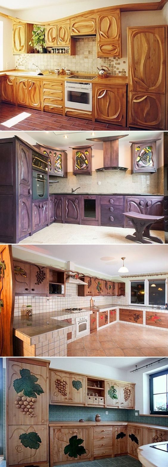 Для оформления фасадов на кухне талантливый мастер использует необычные линии, витражи и объёмные детали. С такой мебелью кухня, без сомнения, станет любимым местом в доме.