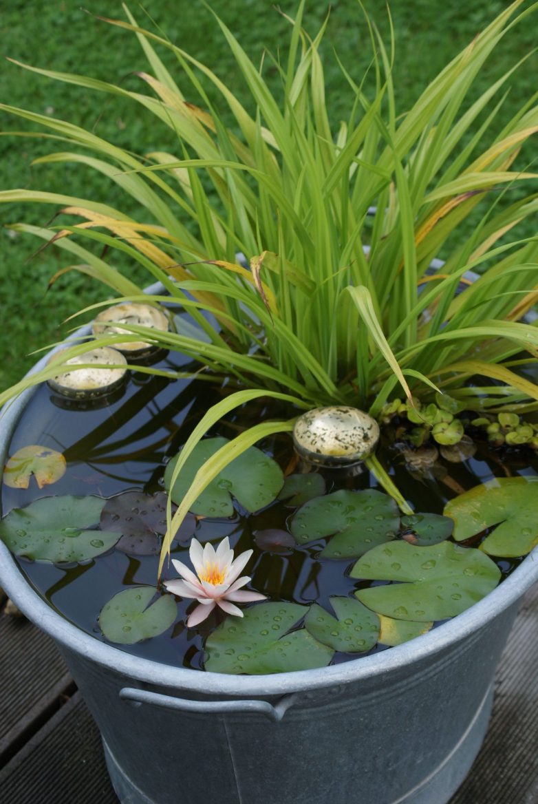 Оцинкованная ванна с водяными лилиями и синим стеклянным шаром