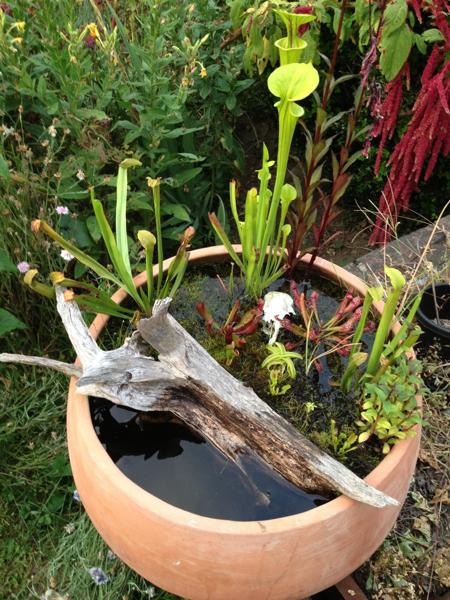 Мини-пруд из керамического вазона с корягами, зеленью и мхом — естественное украшение для сада