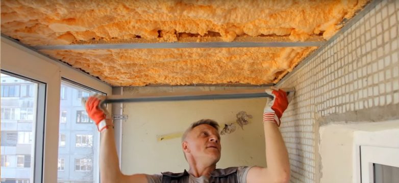 Для потолка используйте металлический каркас и сэндвич панели. Технология та же. Теплый участок балкона, то есть стену, выходящую в комнату, утеплять не нужно, достаточно ее просто обшить.