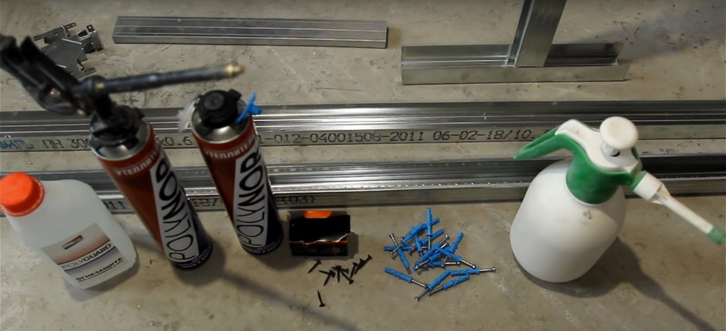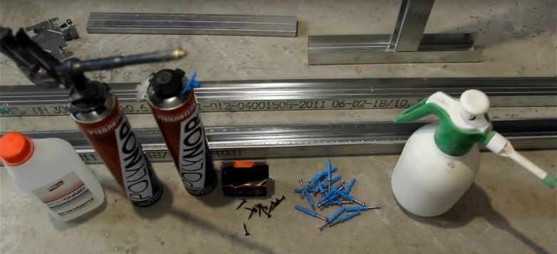 Затем необходимо смонтировать каркас, к которому затем будет крепиться сендвич-панель или гипсокартон. Можно начать, например, с оконной стенки. Итак, с помощью металлического профиля монтируем каркас, а затем заливаем распыляемый утеплитель в щели. После с помощью специальной насадки напыляем в одну из образовавшихся ячеек утеплитель. Поверхность должна быть чистой и сухой, а баллон перед работой должен пройти акклиматизацию: минимум сутки полежать в помещении, где проводятся работы.