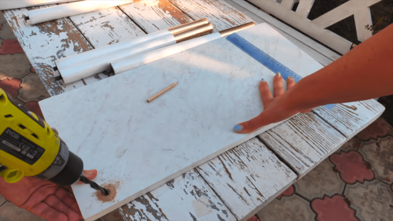 Чтобы не делать лишних дырок в чемодане, используем дополнительно мебельный щит подходящего размера. Использовать с этой целью можно полки или дверцы от старой корпусной мебели.