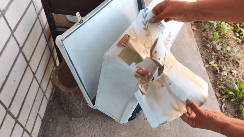 Чемодан можно покрыть краской как снаружи, так и изнутри. При желании внутреннюю отделку можно сделать и другой. Никто не помешает также разделить вместительный короб на секции.