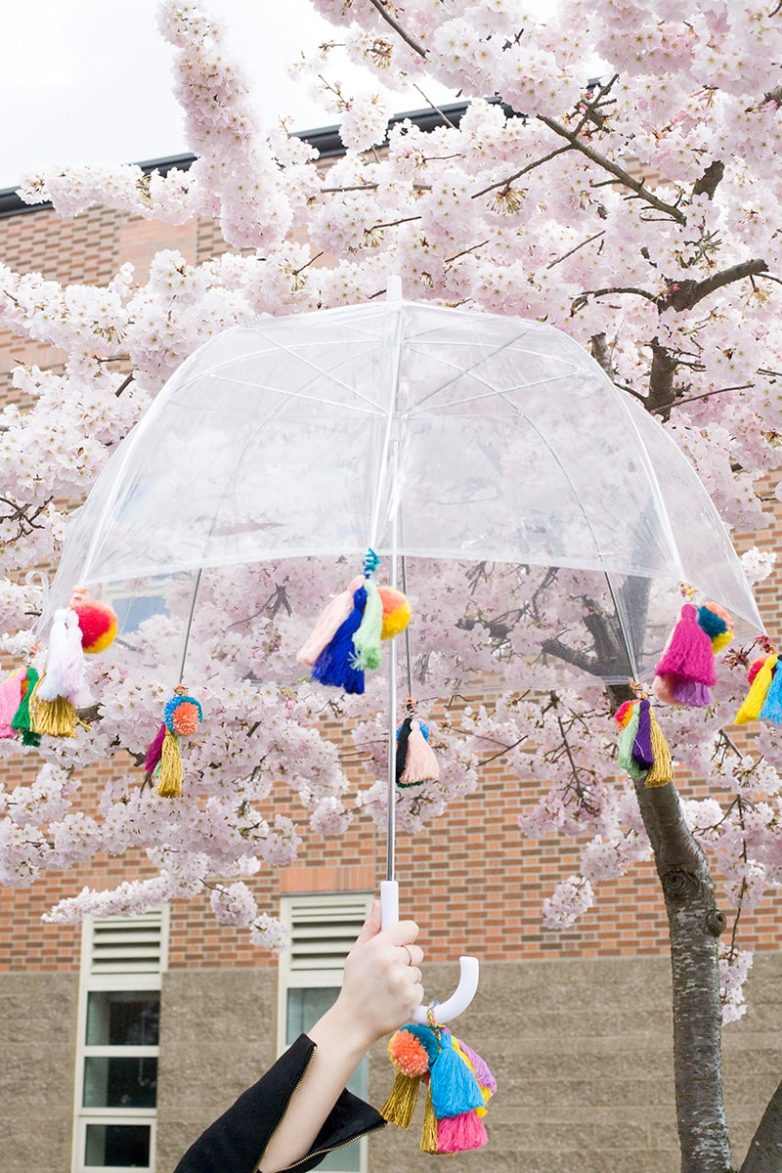 Ни какая депрессия не страшна, если от дождя защищаться с помощью зонтика с яркими кисточками и помпонами.