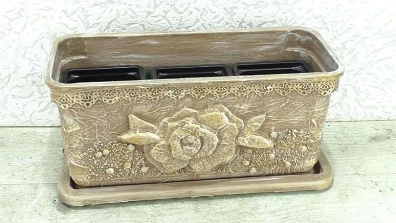 Сделайте объёмный цветок в 2-3 ряда и приклейте к контейнеру. Вокруг также можно добавить кружево.