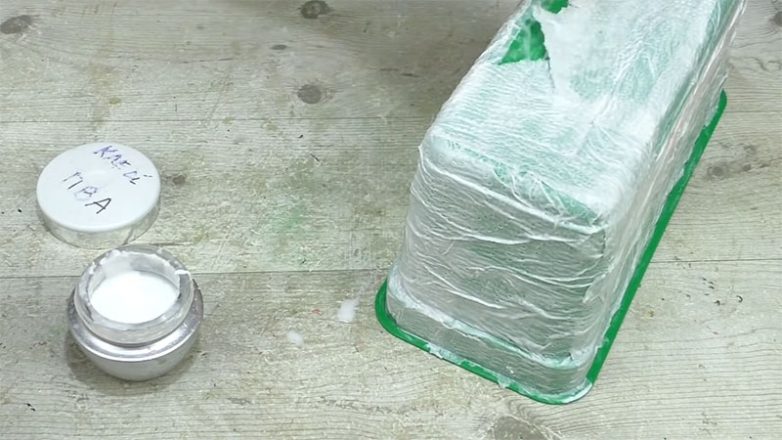 На поверхность контейнера с помощью клея ПВА, разведённого пополам с водой, прикеить бумажные полотенца.