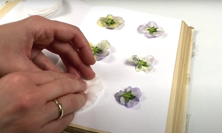 Можно выложить цветы между половинками ватного диска, не перестилая бумагой.