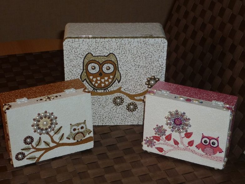 Очень красиво смотрятся шкатулки, украшенные скорлупой и перламутровыми бусинами. Любая модница будет рада иметь такую шкатулку для хранения своих украшений.