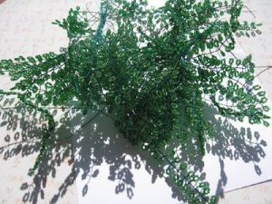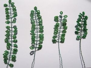 Ветки различаются по количеству листьев и тону зеленого бисера. Всего должно получиться: из светло-зеленого бисера – 14 веточек по 17 листков; из зеленого бисера – 24 ветки по 17 листочков, 24 ветки по 25 листьев, 14 веточек по 33 листочка.