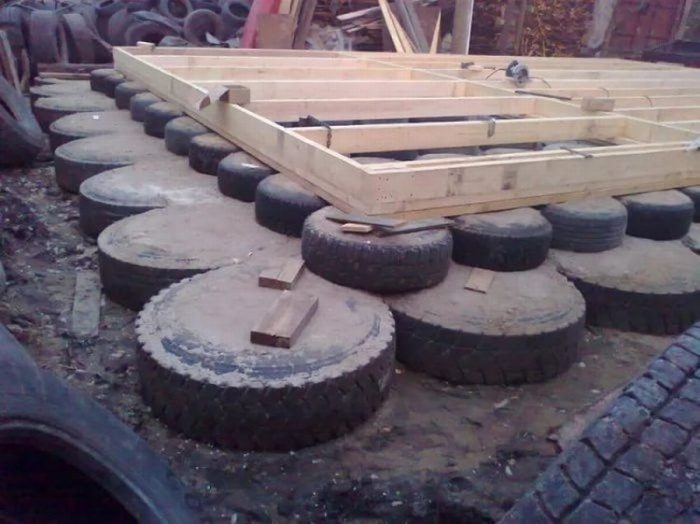 Старые покрышки можно использовать также для создания фундамента какой-либо небольшой или временной постройки. Покрышка станет идеальным элементом для повышения жесткости. Например, на десяток-другой отработавших свое шин можно с легкостью установить контейнер или дом-времянку.