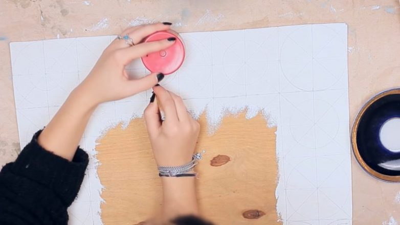 Линейкой, карандашом, циркулем и подходящими круглыми предметами (крышки, тарелки) разделим плоскость на квадраты, внутри которых нарисуем круги разного диаметра и с разными мелкими деталями.
