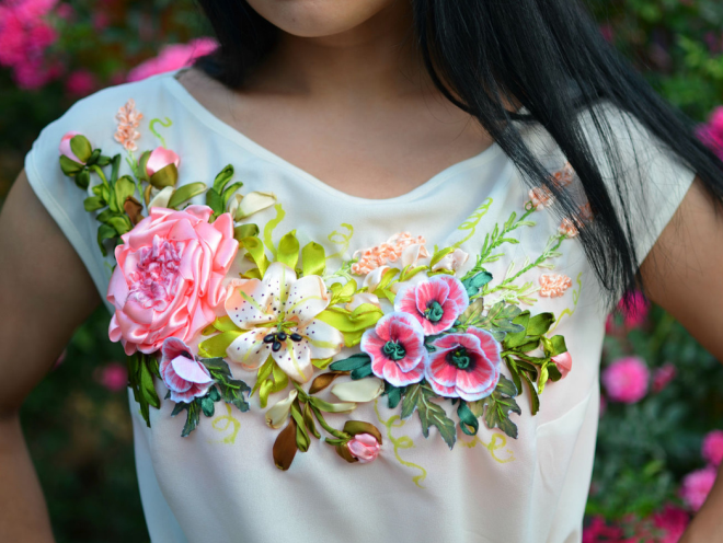 Декоративная вышивка лентами издавна используется для украшения одежды, предметов интерьера, личных вещей, помогая реализовывать самые разнообразные креативные идеи. Обучиться данной технике рукоделия очень легко, она имеет массу преимуществ и дарит радость от быстрого результата.