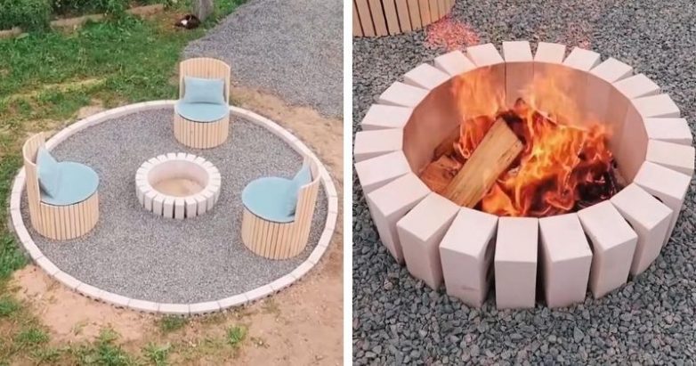 Затем выложите кирпичи по краю и в центре — там, где будет кострище. Закрепите кирпичи, чтобы они стояли ровно, до полного высыхания цементного раствора.